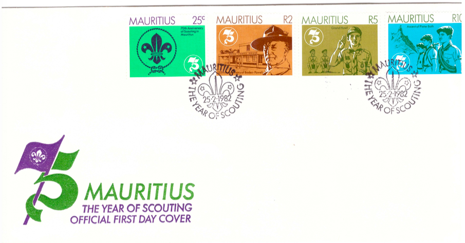 Issued on February 25, 1982, this set celebrates 75 years of the Scouting movement's presence in Mauritius, highlighting its founder and local activities, and reflecting the global impact of Scouting on youth development.