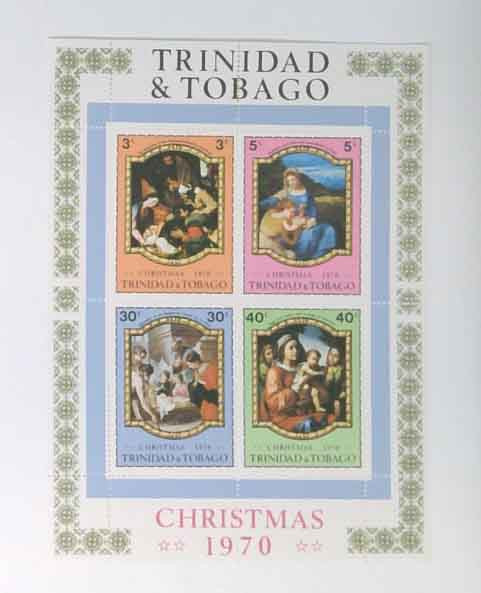 This souvenir sheet from Trinidad & Tobago features four Christmas-themed stamps issued in 1970. The designs depict classic religious art, including scenes of the Nativity and the Madonna and Child, celebrating the festive season.